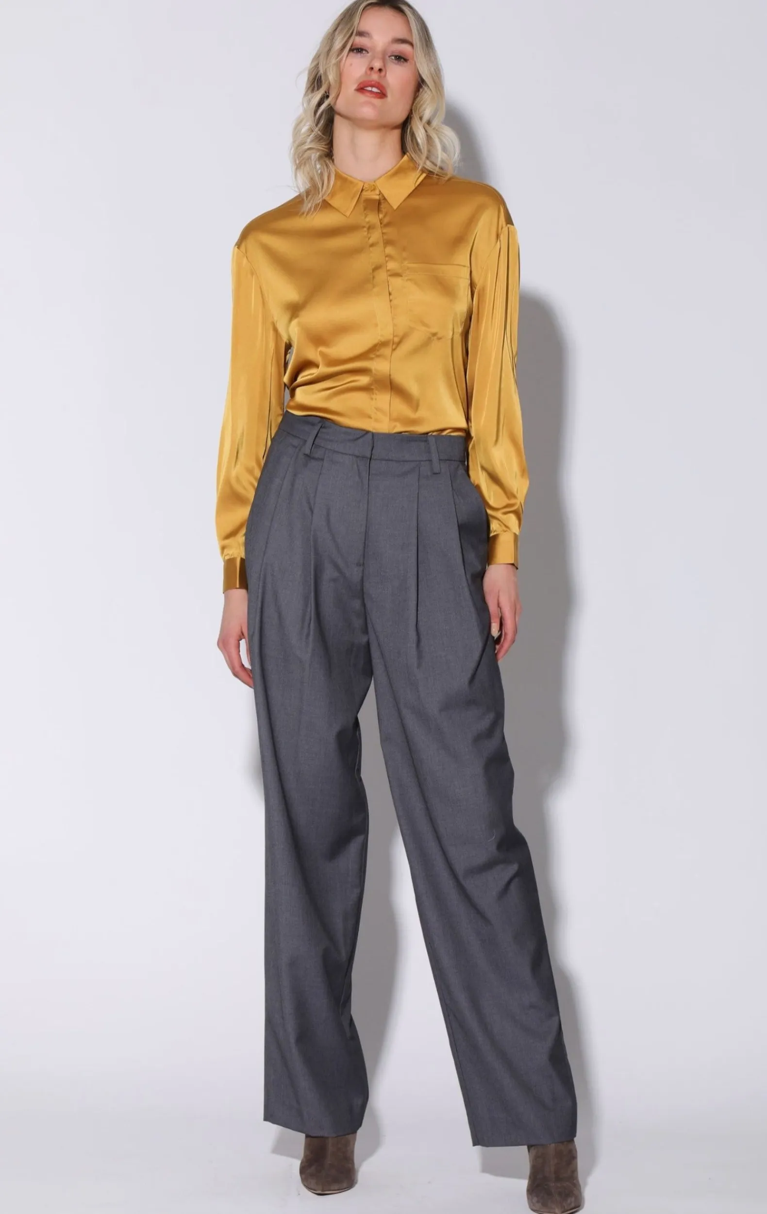The Classic Boyfriend Style Button Down Gets A Charmeuse Upgrade In Our Bella Top!