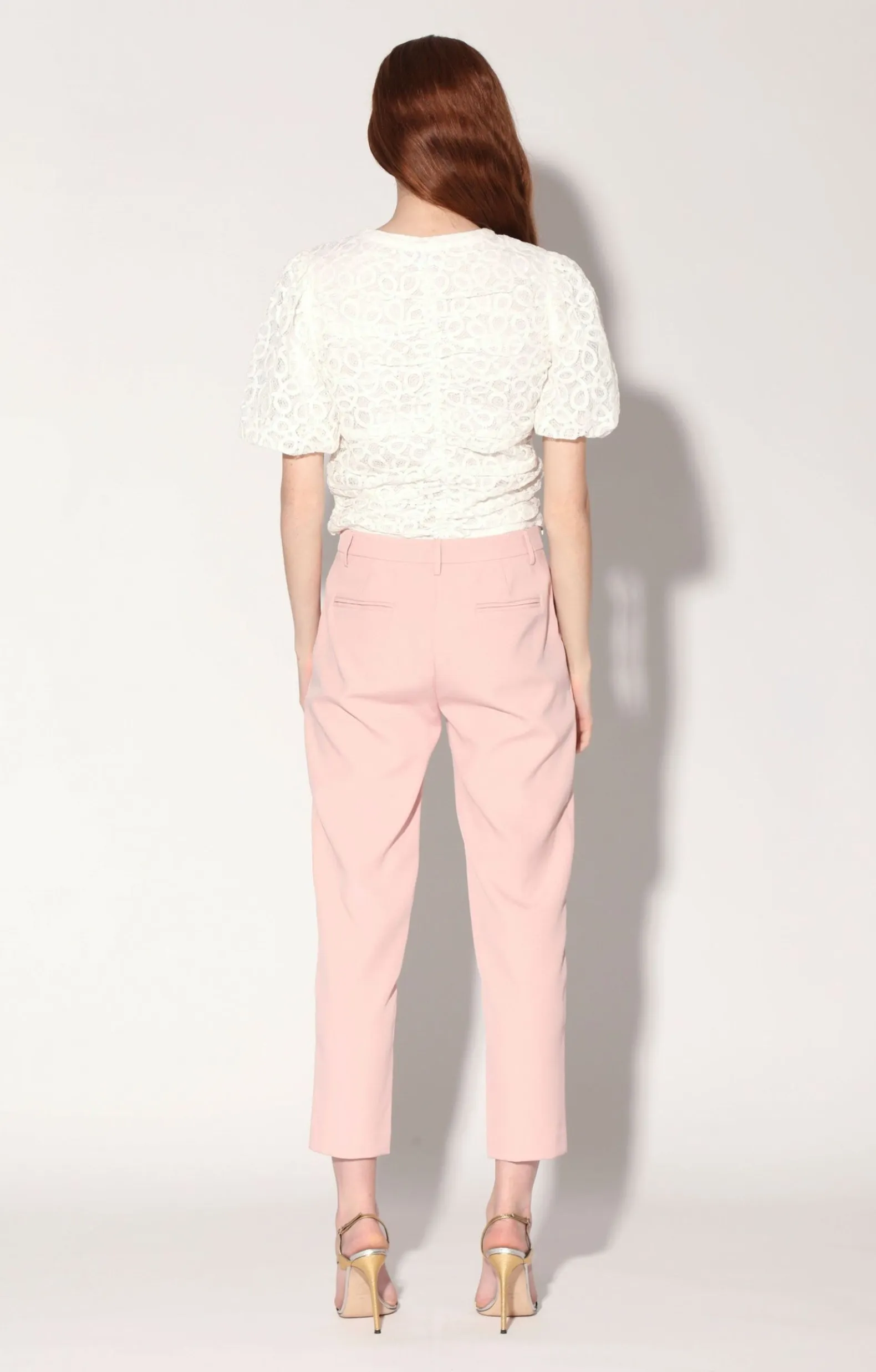 Crew Neck; Button Down Closure; Fitted Shape; Side, Center Back And Front Placket Shirring Detail; Short Balloon Sleeves; Fully Lined