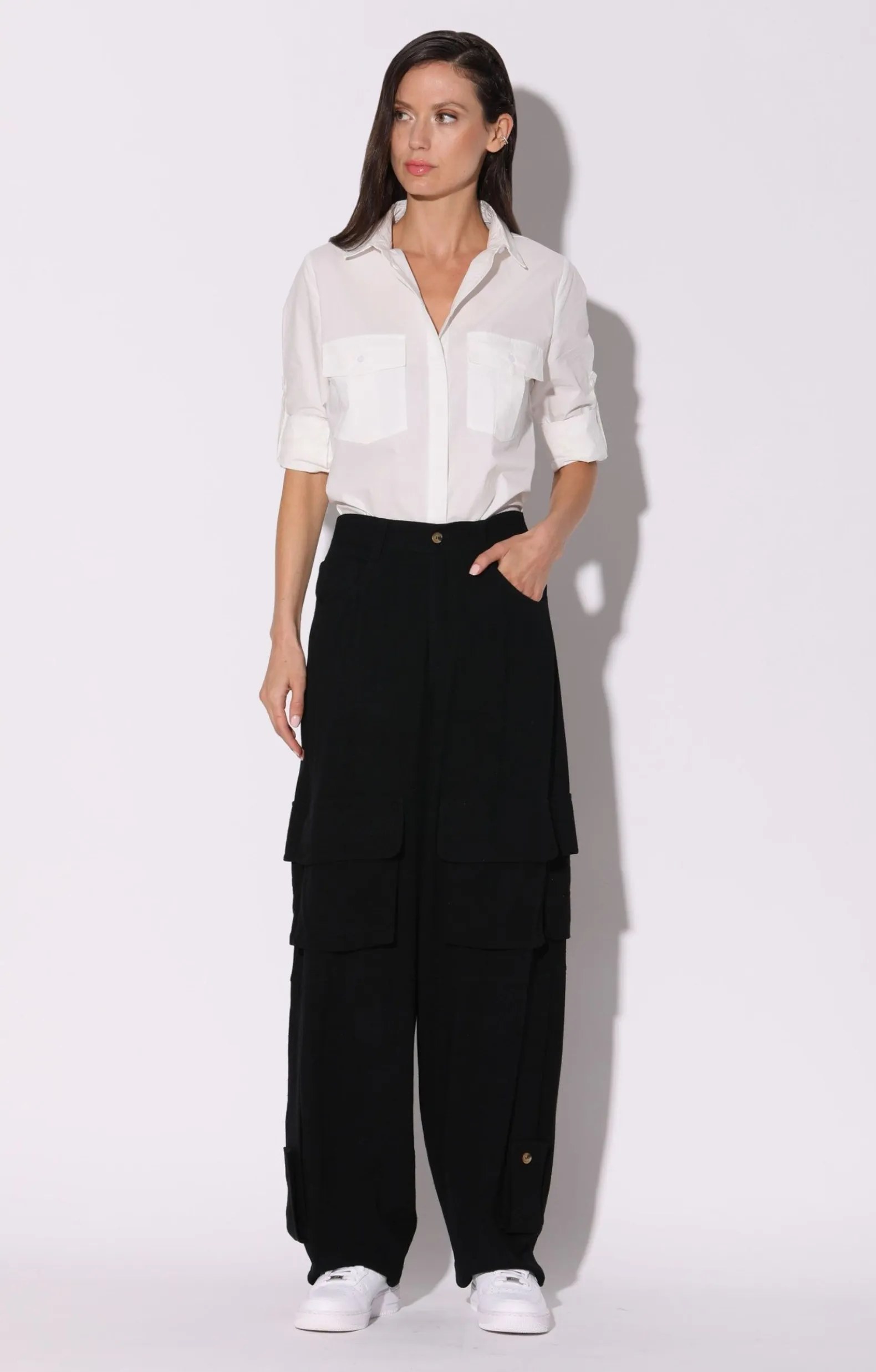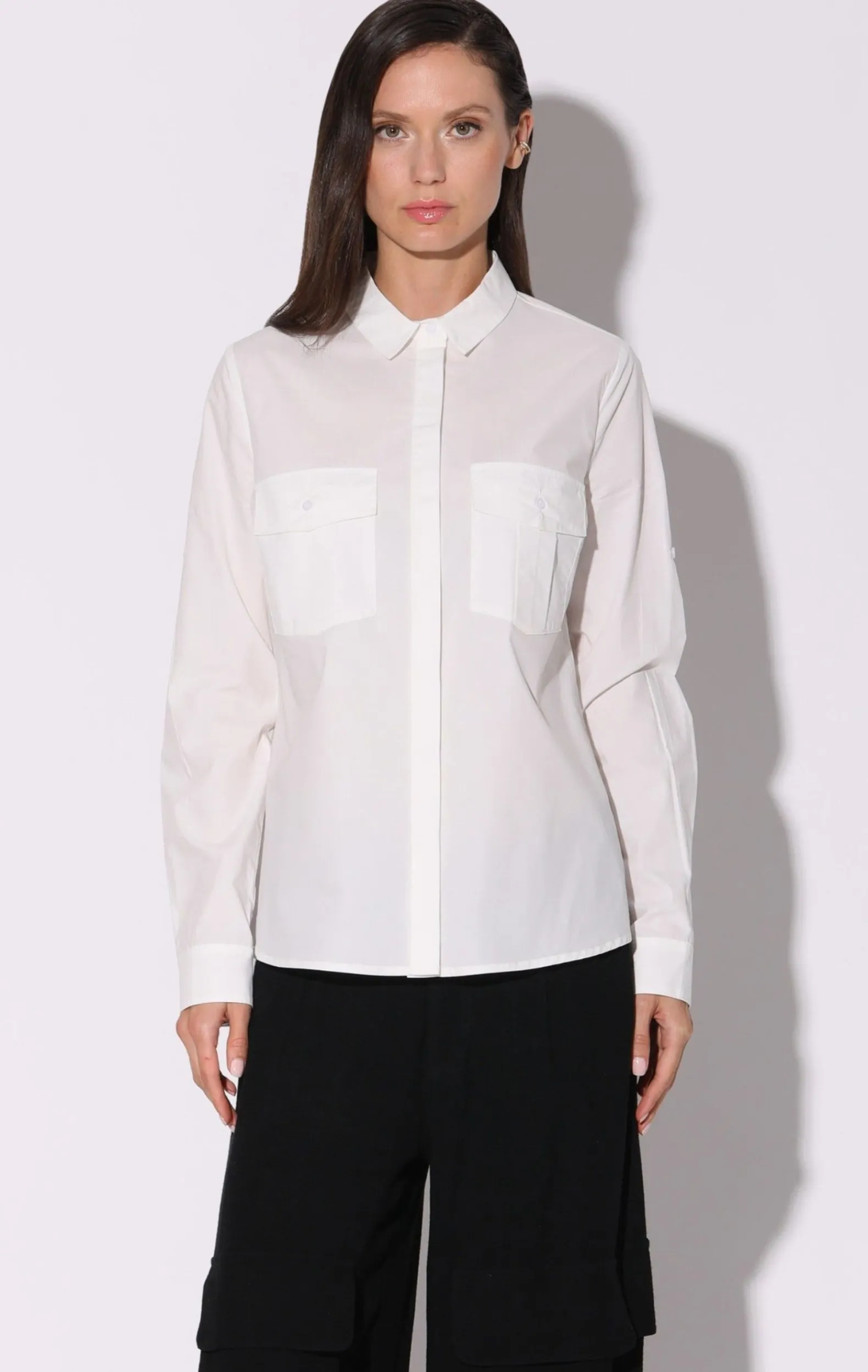 A Utility Style Button Down, The Marsha Top Features Front Chest Cargo Pockets And Roll Up Sleeve Option. Try It Tied In The Front For A Warmer Weather Update.